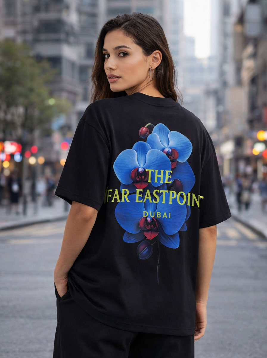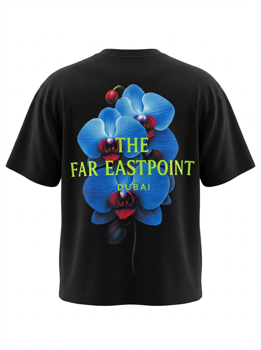 Bold oversized tee featuring vibrant blue orchids and neon Far Eastpoint Dubai branding. Designed with a relaxed fit, soft premium fabric, and a modern streetwear silhouette—perfect for everyday statement style.
